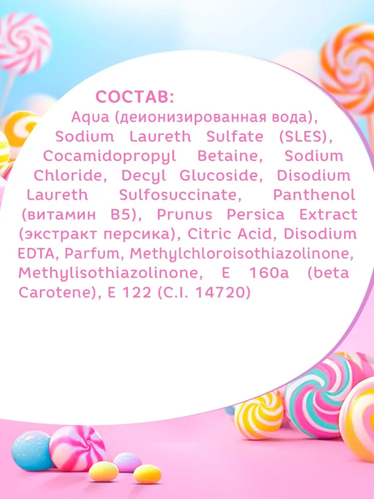Aqua (деионизированная вода), Sodium Laureth Sulfate (SLES), Cocamidopropyl Betaine, Sodium Chloride, Decyl Glucoside, Disodium Laureth Sulfosuccinate, Panthenol (витамин В5), Prunus Persica Extract (экстракт персика), Citric Acid, Disodium EDTA, Parfum, Methylchlоroisothiazolinone, Мethylisothiazolinone, Е 160а (beta Carotene), E 122 (С.I. 14720).