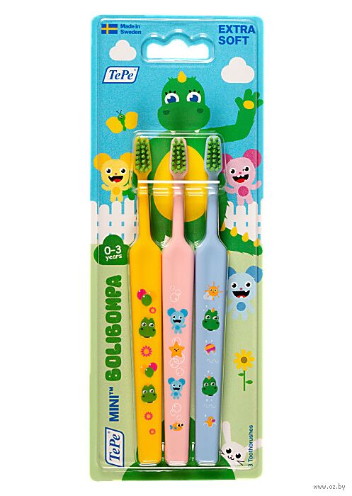 TePe Mini Bolibompa – зубная щетка для детей от первого зубика до 3 лет. Это высококачественная зубная щётка с удобной ручкой, конической головкой и закруглёнными кончиками щетинок. Коническая головка щетки улучшает доступ. Очень мягкие цветные щетинки с закругленными кончиками обеспечивают бережную чистку, не травмируют мягкие ткани. Зубная щетка имеет милый рисунок и небольшую ручку, которая одинаково удобно сидит и в маленькой детской руке, и во взрослой.