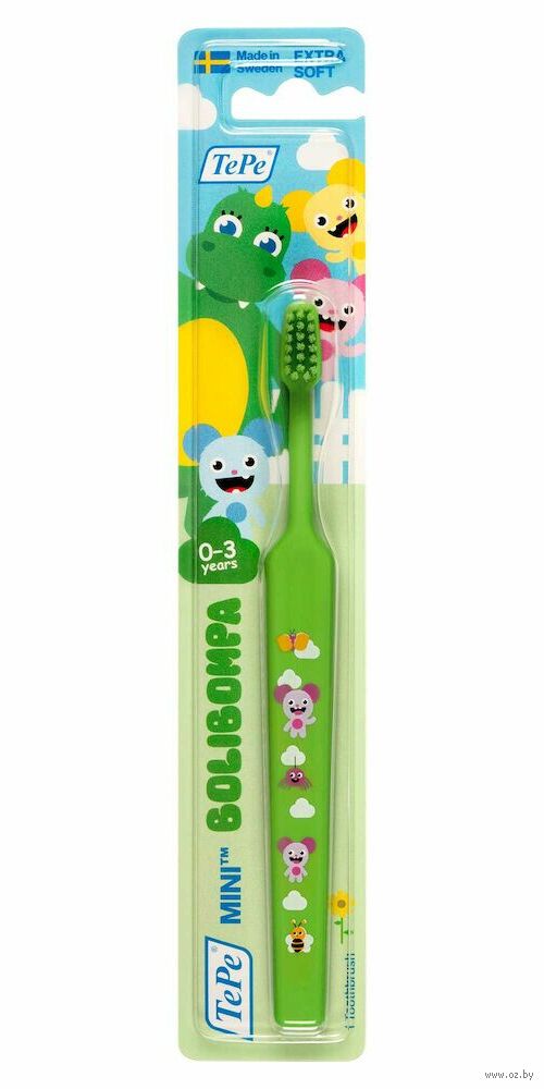 TePe Mini Bolibompa – зубная щетка для детей от первого зубика до 3 лет. Это высококачественная зубная щётка с удобной ручкой, конической головкой и закруглёнными кончиками щетинок. Коническая головка щетки улучшает доступ. Очень мягкие цветные щетинки с закругленными кончиками обеспечивают бережную чистку, не травмируют мягкие ткани. Зубная щетка имеет милый рисунок и небольшую ручку, которая одинаково удобно сидит и в маленькой детской руке, и во взрослой.