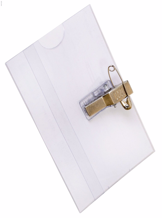 Стандартный бейдж из прозрачного ПВХ. На обратной стороне имеется зажим и булавка для удобного крепления на одежде. Дополнительно в комплекте пустой вкладыш.