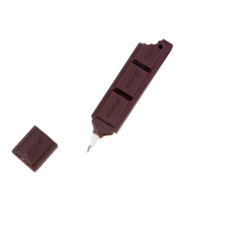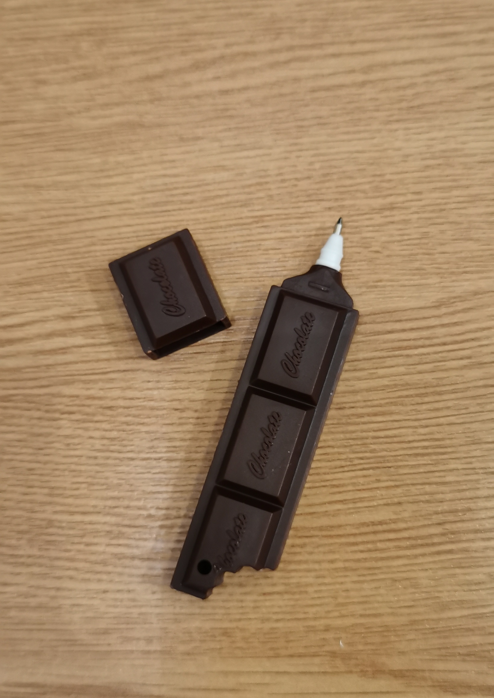 Вот такая шоколадная ручка. Симпатичная. Оригинально выглядит. Пишет обычным синим стержнем.