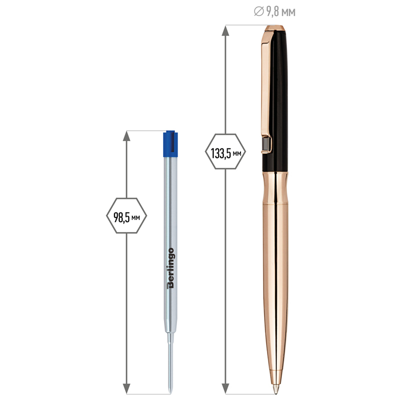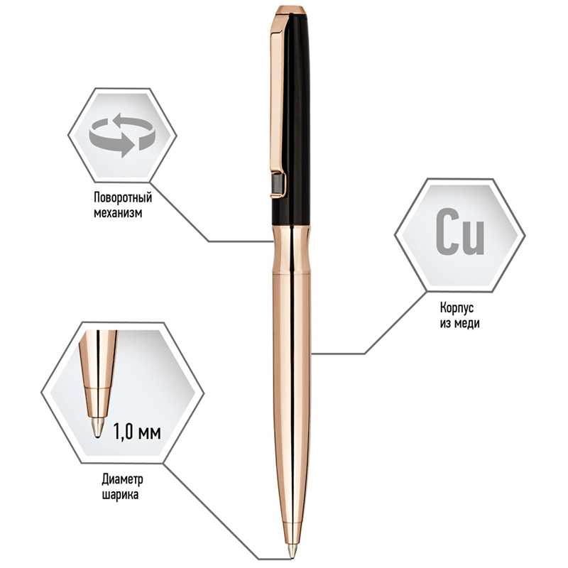Глянцевый чёрно-золотой корпус дополняет коричневый клип с золотым обрамлением, который напоминает дерево. Клип сделан из нержавеющей стали, он позволяет фиксировать ручку на ежедневниках, блокнотах и карманах одежды.