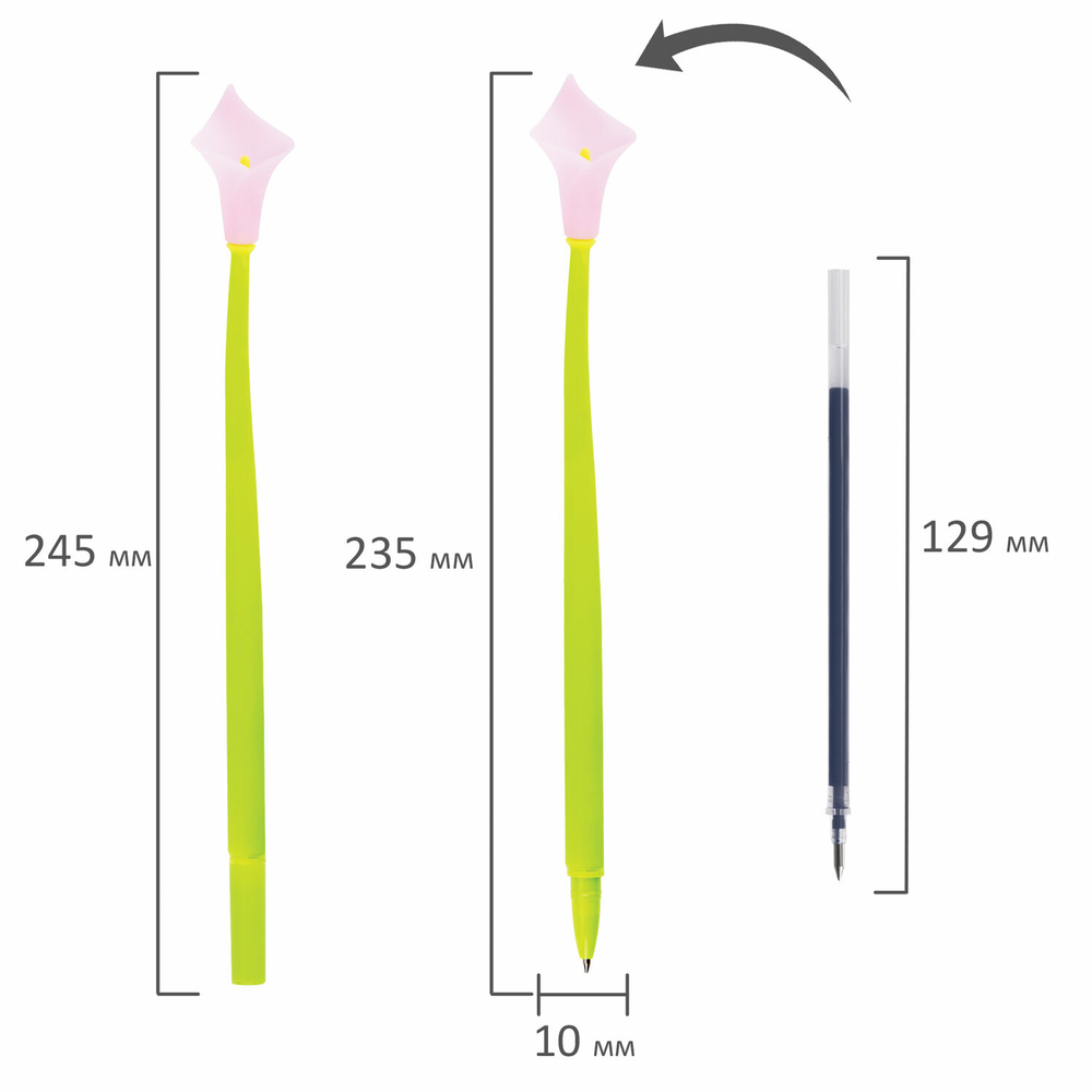 Диаметр игольчатого пишущего узла, равный 0,7 мм, создает линию письма, равную 0,35 мм. Длина сменного стержня составляет 129 мм. Цвет чернил – синий.