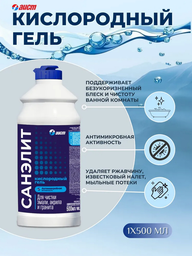 Санэлит – кислородный гель для чистки ванны и других предметов ванной комнаты. Эффективно удаляет ржавчину, известковый налет, мыльные потеки.