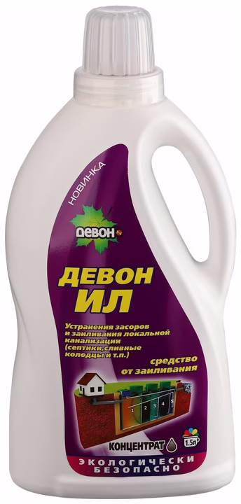 Средство "Девон-ИЛ" – это высокоэффективное средство для профилактики и устранения засоров и заиливания локальной канализации (септики, сливные колодцы, поля фильтрации и т.п.). Жидкость "Девон-ИЛ" быстро и эффективно устраняет неприятные запахи, не боится замерзания, не боится сливов моющих средств, экологически безопасно.