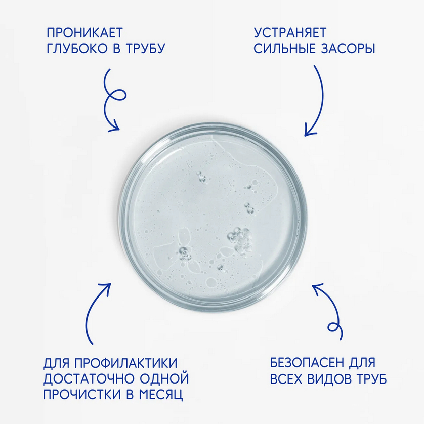 Гель предназначен для прочистки сливных отверстий и канализационных труб от засоров и грязи. Благодаря густой консистенции глубоко проникает в трубы и эффективно устраняет даже очень сильные засоры. Очищает сливные сифоны и трубы у раковин, моек, ванн, унитазов и т.д. от окиси, ржавчины и грязи. Эффективно растворяет бумагу, волосы, пищевые отходы и другие загрязнения органического происхождения.