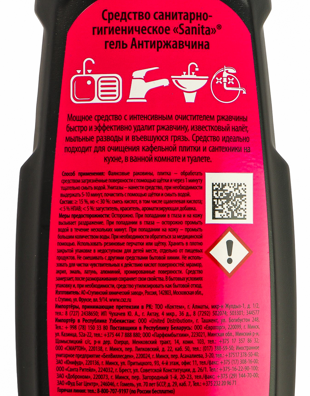 Мощное средство с интенсивным очистителем ржавчины быстро и эффективно удалит ржавчину, известковый налет, мыльные разводы и въевшуюся грязь. Средство идеально подходит для очищения сантехники и кафельной плитки на кухне, в ванной комнате и туалете.