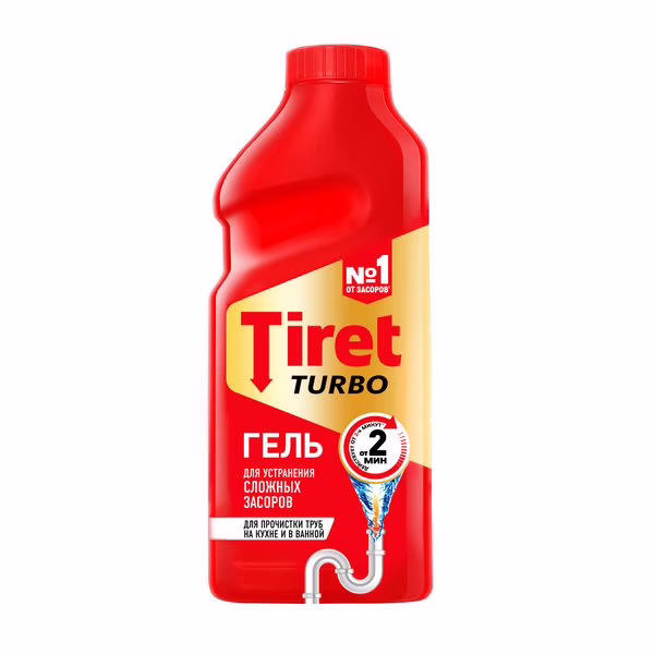 Продукт эффективно и быстро справляется даже со сложными засорами, начиная действовать от 2 минут. Tiret Turbo безопасен для большинства видов труб, идеально подходит для очищения труб в ванной комнате и кухне. Благодаря своей густой формуле гель проникает в трубы даже в стоячей воде, удаляя засоры различной природы, такие как: жир, остатки пищи, мыльный налет, волосы и т.д.
