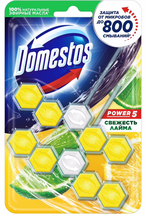 Блок для очищения унитаза Domestos Power 5 Антиналет Свежесть Лайма против известкового налета и неприятного запаха – это пять преимуществ, помогающих обеспечить защиту от загрязнений и микробов и сохранить чистоту и блеск. При каждом смывании появляется бодрящий аромат лайма на срок до 4 часов и обильная пена, которая борется с налетом, поддерживая гигиену и блеск поверхности унитаза.