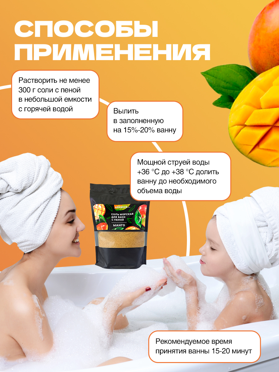 Растворить не менее 300 г соли с пеной в небольшой емкости с горячей водой. Вылить в заполненную на 15%-20% ванну. Долить до необходимого объема под мощной струей воды температурой от + 36°С до + 38°С. Рекомендуемое время принятия ванны 15-20 минут.Состав