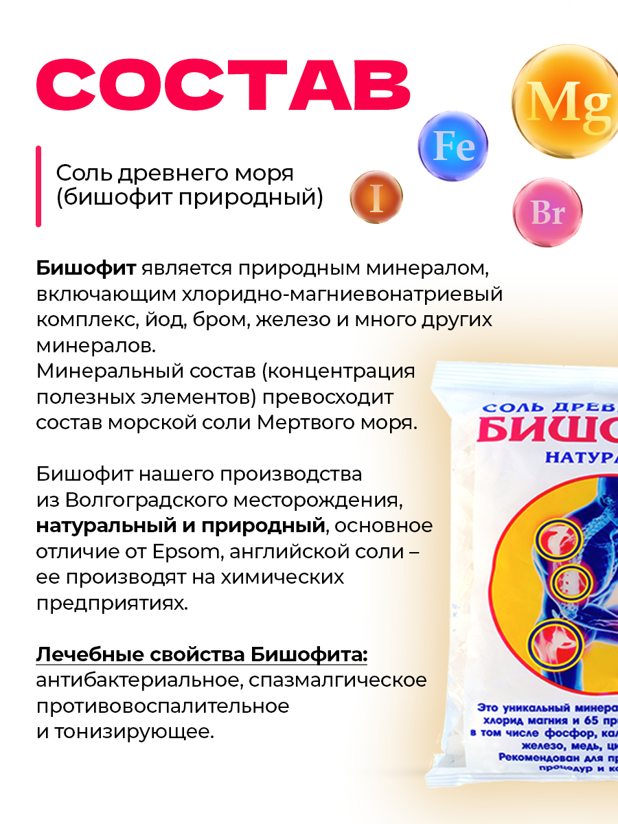 Бишофит является природным минералом, включающим хлоридно-магниевонатриевый комплекс, йод, бром, железо и другие минералы.
