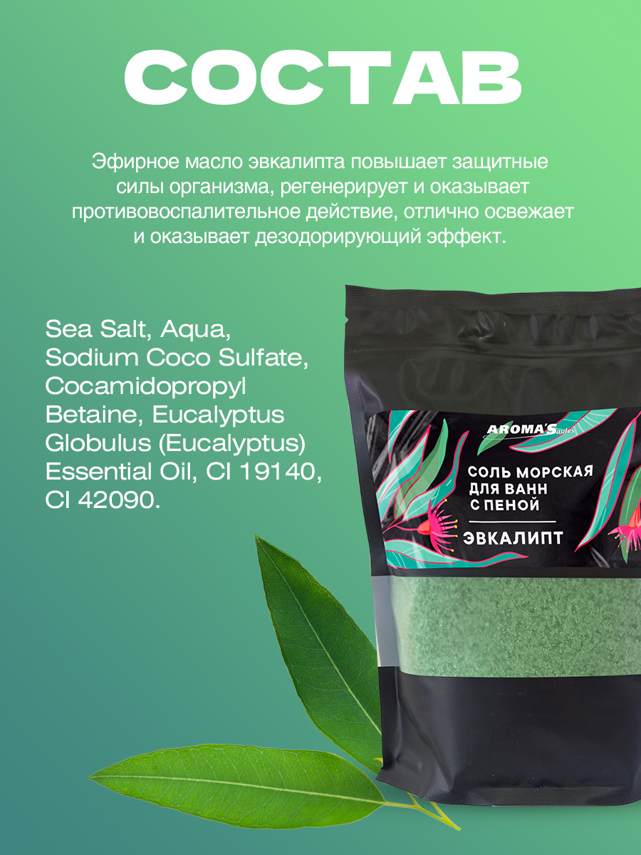 Sea salt, aqua, sodium coco sulfate, cocamidopropyl betaine, eucalyptus globulus (eucalyptus) essential oil, ci 19140, ci 42090.