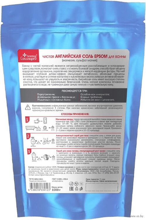 Английская соль имеет высокую степень очистки, что делает ее максимально безопасной. Очень мелкие кристаллы мгновенно растворяются в воде, не травмируя даже самую нежную и чувствительную кожу.
