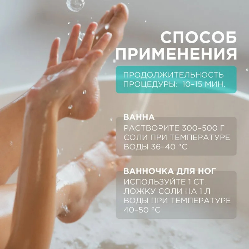Растворить 300-500 грамм соли во всем объеме ванны при температуре воды 36-40 градусов.Состав