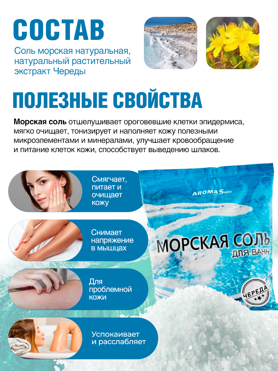 Солевые ванны, полученные в результате растворения морских солей, являются прекрасным восстанавливающим, тонизирующим и косметическим средством. Ванны снимают усталость и мышечное напряжение, успокаивают нервную систему, оказывают укрепляющее и тонизирующее действие на организм, смягчают и очищают кожу, восстанавливают ее упругость и эластичность, проявляют омолаживающий эффект. Введение в морские соли натуральных растительных и минеральных добавок (хвои, валерианы, эвкалипта, шалфея, бишофита, калий йода и калий брома, сернистого натрия и многих других) увеличивает эффективность проведения процедур.