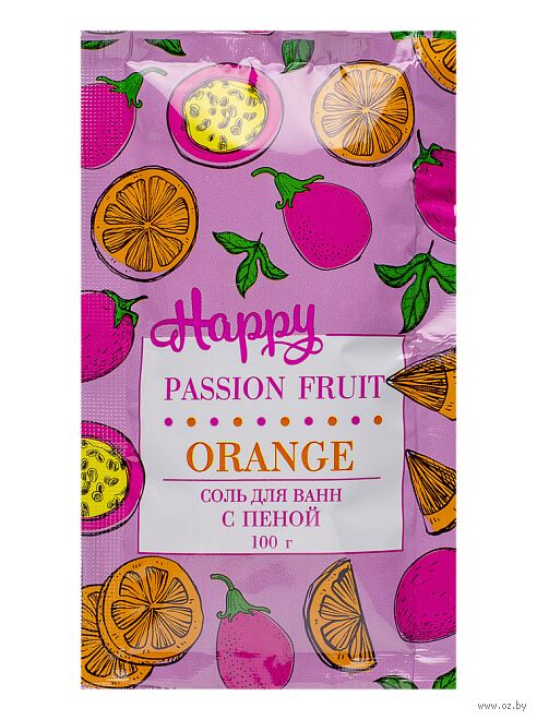 Апельсин и маракуйя: какой яркий дуэт! Новая соль из серии "Happy" с пеной для расслабления и купания. Прими ванну и ощути на себе нежнейшие пузырьки пены и притягательный, "вкусный" аромат.