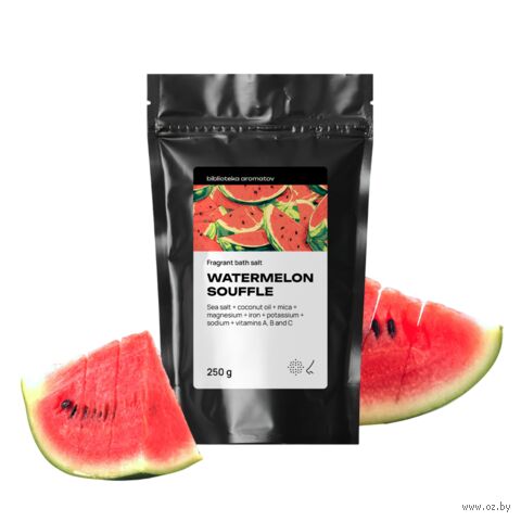 Для тех, кто круглый год скучает по арбузу, производитель выбрал самый вкусный и поместил в пакет. Тонизирующая соль "Арбузное суфле" напоминает дольку самого спелого и сочного арбуза. Масло кокоса и экстракт арбуза в составе питают кожу.