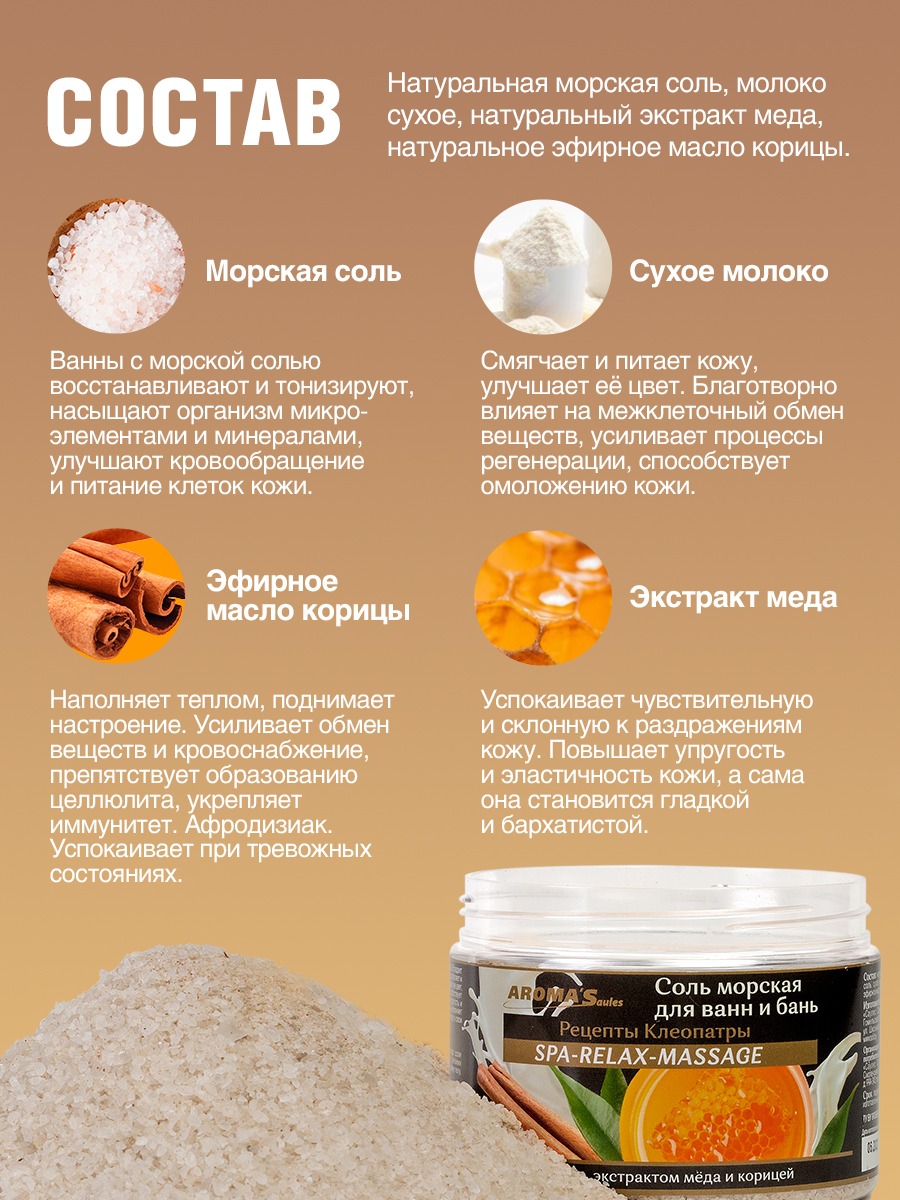 Натуральная морская соль, молоко сухое, натуральный экстракт меда, натуральное эфирное масло корицы.