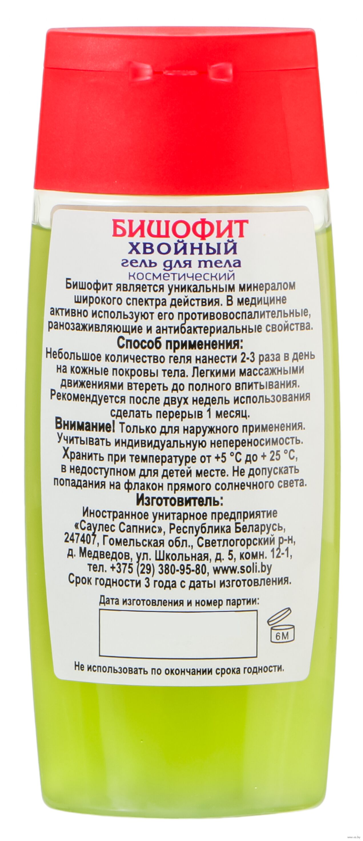 Бишофит, очищенная вода, сорбитол, гидроксиэтилцеллюлоза, консервант, натуральный экстракт зелени хвойной.