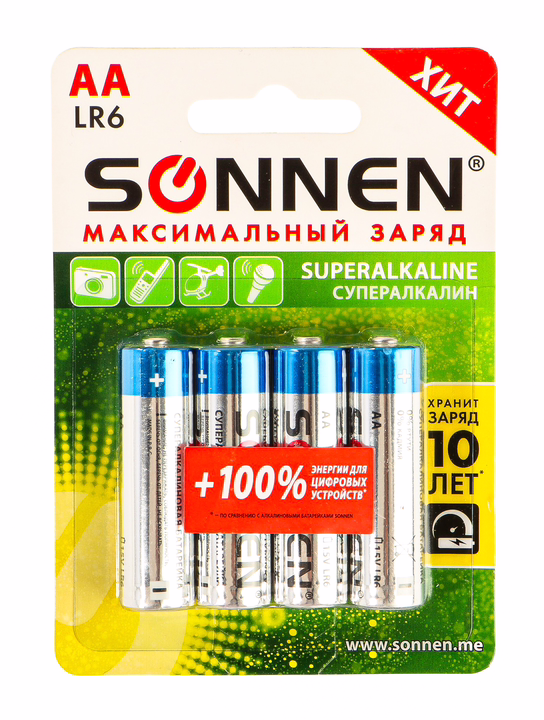 Супералкалиновые батарейки SONNEN популярного типоразмера AA идеально подходят для приборов с высоким потреблением энергии. Рекомендуется использовать в фотовспышках, mp3-плеерах, компьютерных мышах и детских игрушках.