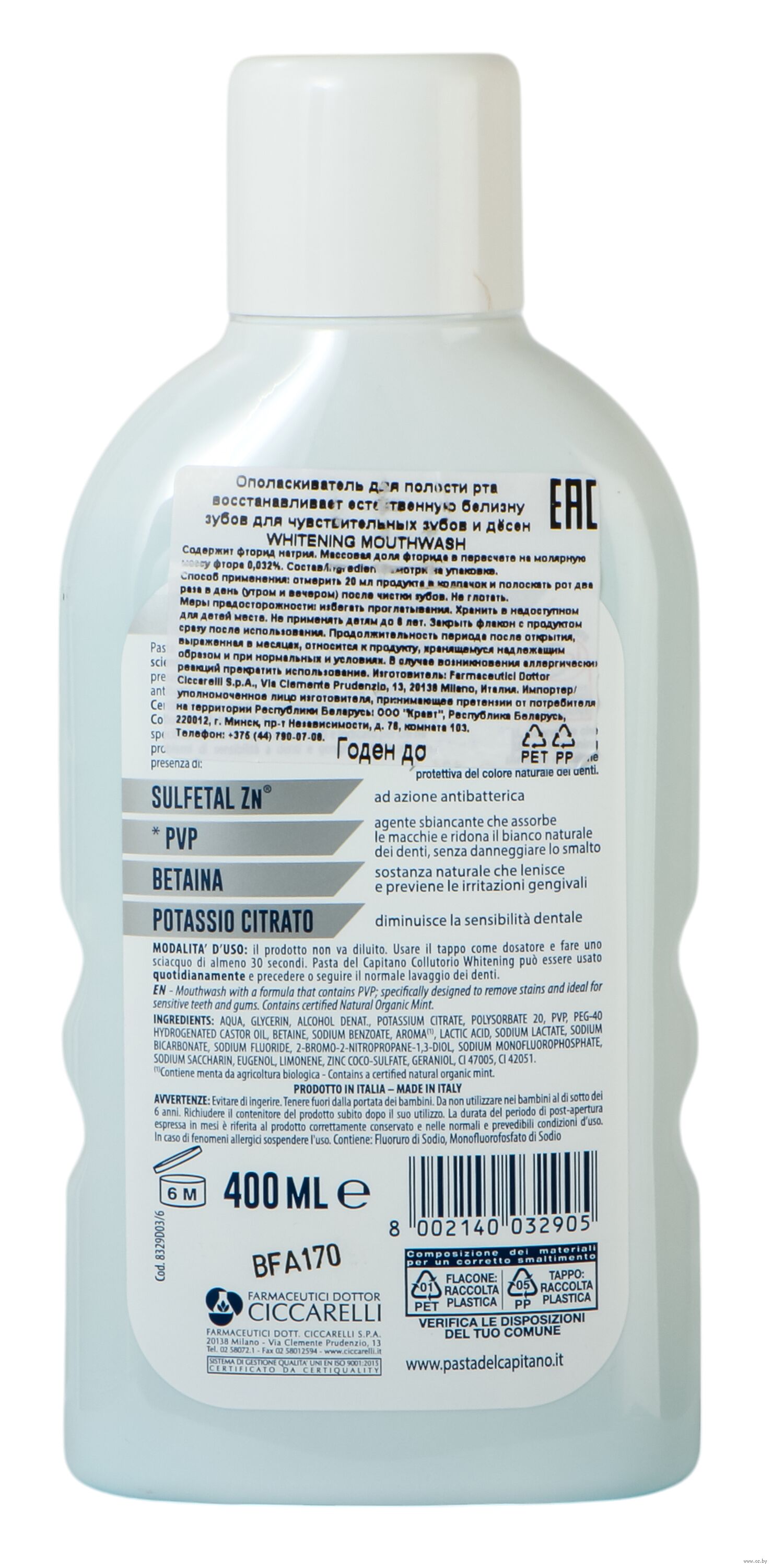Ополаскиватель для полости рта Pasta del Capitano "Whitening Mouthwash" – это идеальный завершающий этап в уходе за полостью рта. Его инновационная формула "Plasdone", позволяет восстановить естественную белизну зубов, при этом не повреждая эмаль, оставляет приятное ощущение свежести благодаря содержанию органической мяты.