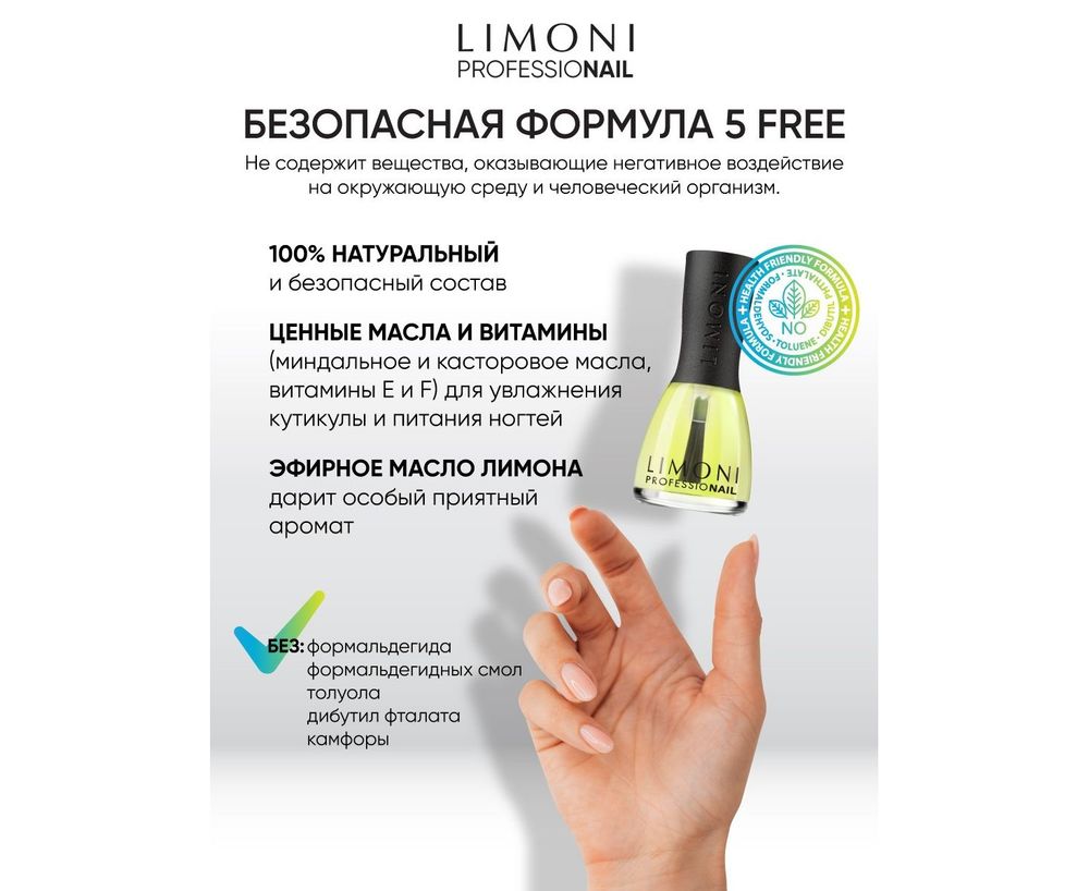 Масло ухаживает не только за кутикулой, но за ногтями. Созданное на основе ценного миндального масла, способствует сохранению естественной влаги кожи вокруг ногтей, питает ее, смягчает кутикулу, устраняет ломкость и расслаивание ногтевой пластины. Для максимальной эффективности состав обогащен касторовым маслом, витаминами E и F. Обладает приятным ароматом благодаря добавлению эфирного масло лимона.