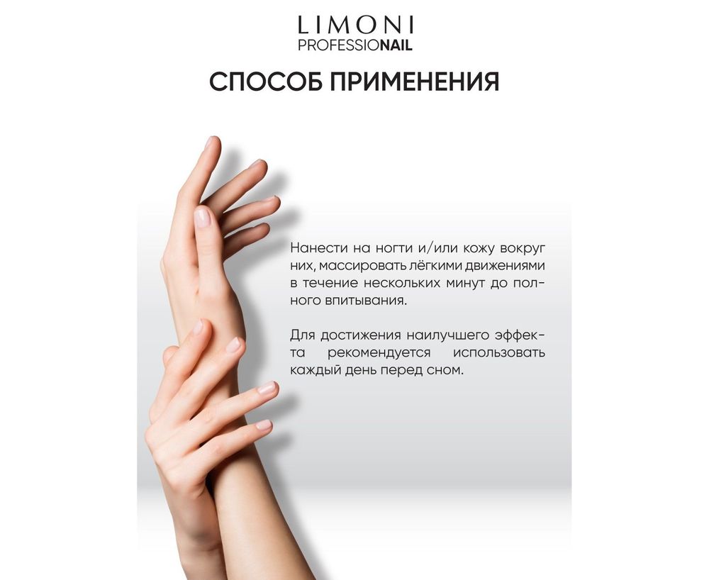 Нанести на ногти и/или кожу вокруг них, массировать легкими движениями в течение нескольких минут до полного впитывания. Для достижения наилучшего эффекта рекомендуется использовать каждый день перед сном.Состав