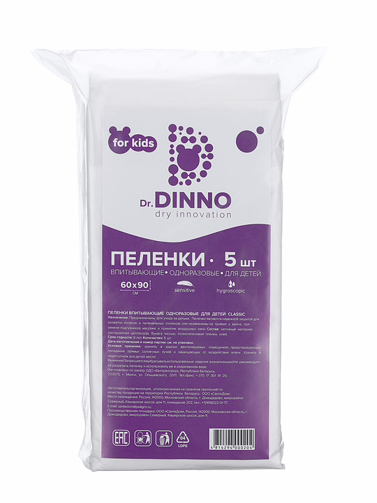 Пеленки гигиенические впитывающие Dr.Dinno предназначены для ухода за детьми. Являются надежной защитой для кроваток, колясок и пеленальных столиков.