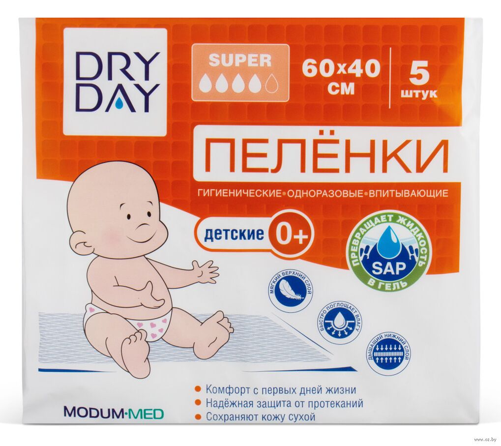 Пелёнки одноразовые детские "Super 0+" (5 шт.; 60х40 см)