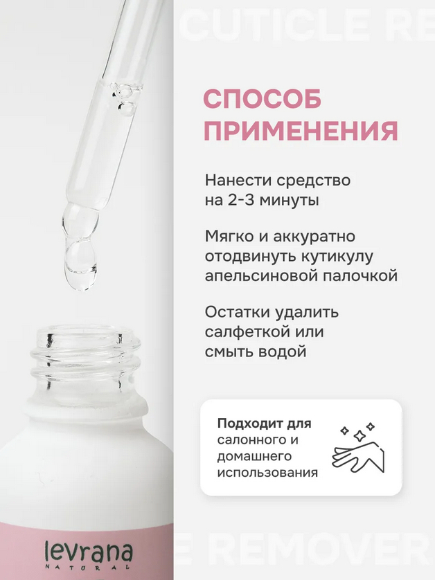 Встряхнуть, нанести средство на 2-3 минуты, мягко и аккуратно отодвинуть кутикулу апельсиновой палочкой. Остатки удалить салфеткой или смыть водой.Состав