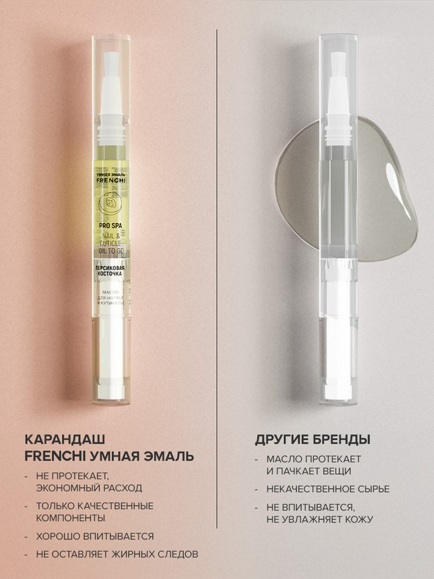 Идеальное решение для тех, кто ценит эффективность и удобство. Масло для ногтей в инновационном формате карандаша создано для ежедневного ухода за ногтевой пластиной и кутикулой, сочетая в себе натуральные компоненты и продуманный дизайн. В основе формулы – масло персиковых косточек, насыщенное витаминами A и E, а также ценными омега-кислотами. Оно бережно питает кожу вокруг ногтя, смягчает кутикулу, предотвращает сухость и появление заусенцев, одновременно укрепляя ногтевую пластину и придавая ей здоровый блеск.