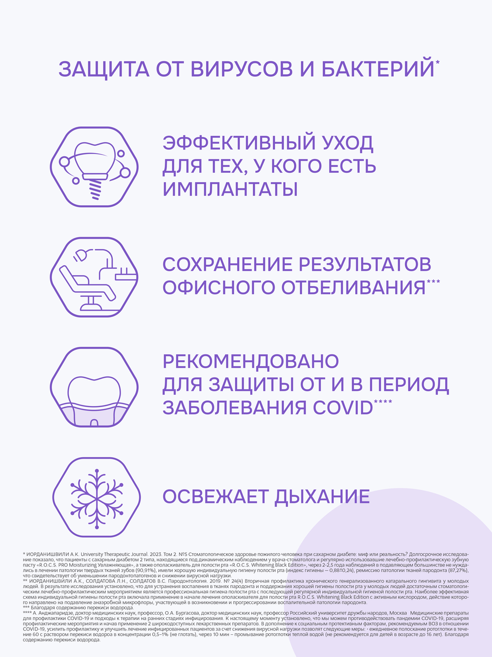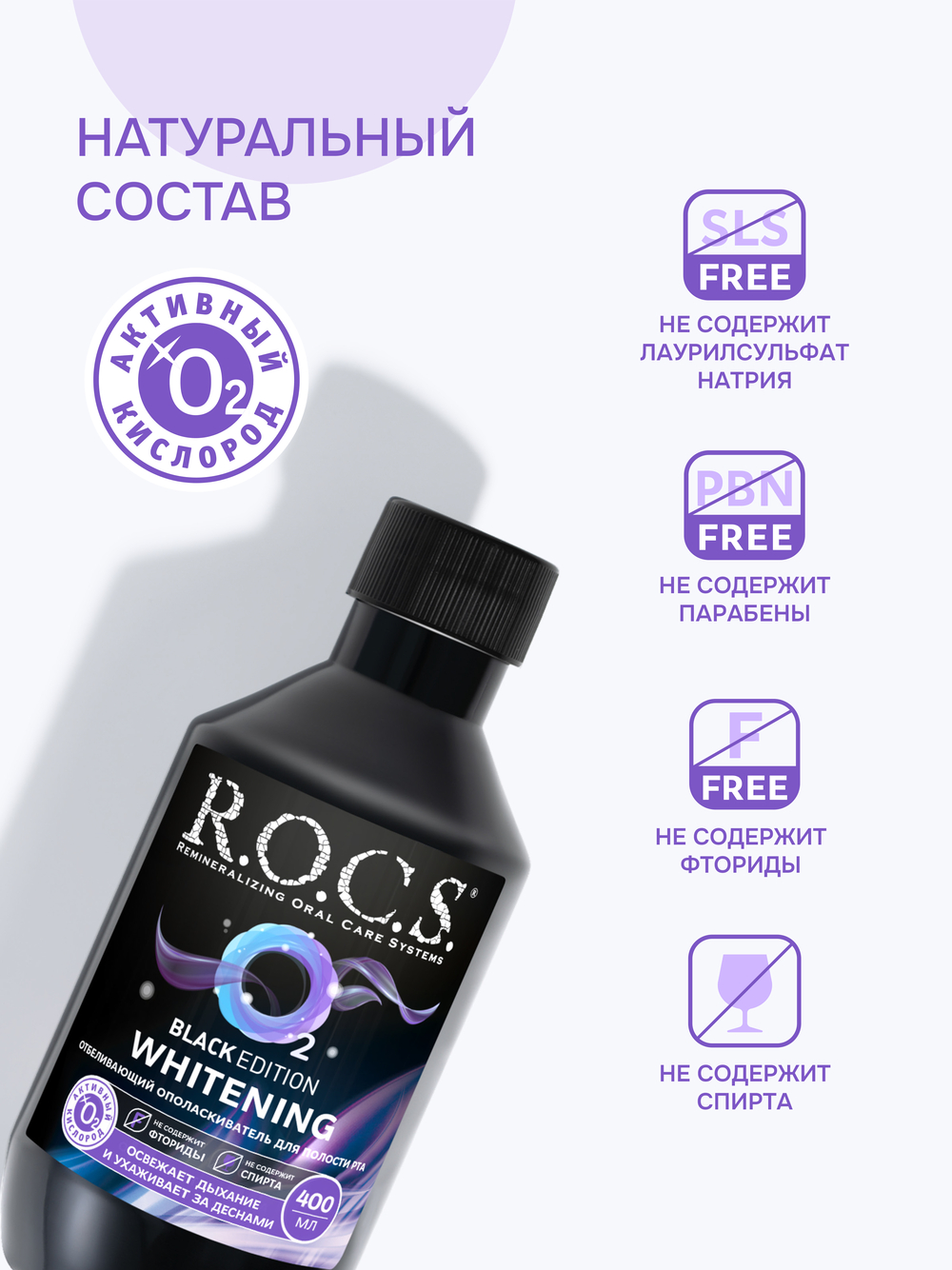 Действие активного кислорода направлено на подавление анаэробной микрофлоры. Ополаскиватель проникает в труднодоступные участки, которые сложно очистить с помощью щетки и зубной пасты. Обладает приятным освежающим вкусом. Идеально подходит для любителей чая, кофе и вина.