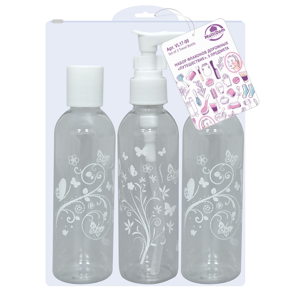 В набор входят три флакона, один из которых с удобным дозатором. Благодаря прозрачной косметичке с замком зип-лок, её содержимое всегда на виду и на своём месте. Изготовлено: флаконы из пластмассы (полипропилен), косметичка из полимерного материала (полиэтилентерфталат).