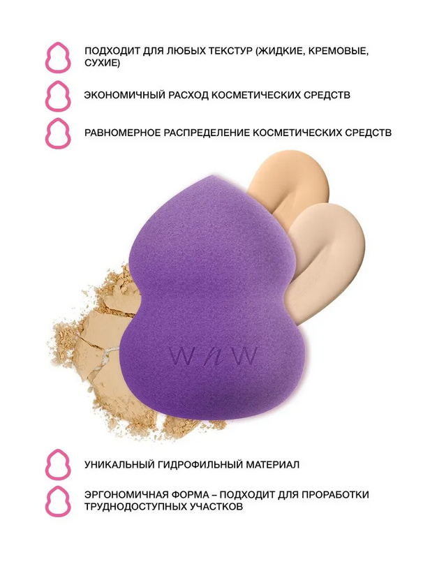 Дизайн спонжа в форме песочных часов и эргономичная форма позволяют удобно держать его в руке. Вы сможете быстро и легко наносить и растушевывать жидкие, кремовые и сухие текстуры.
