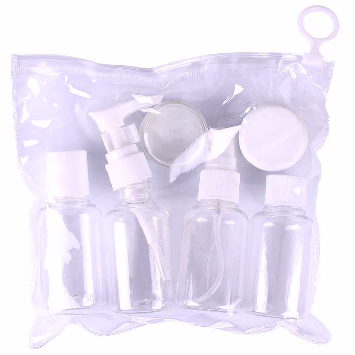 Набор с миниатюрными баночками для косметики, которые удобно брать с собой в путешествие.