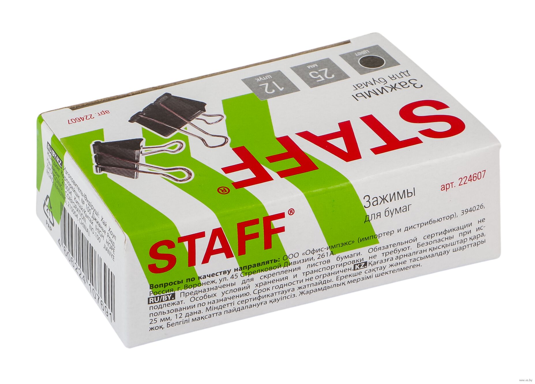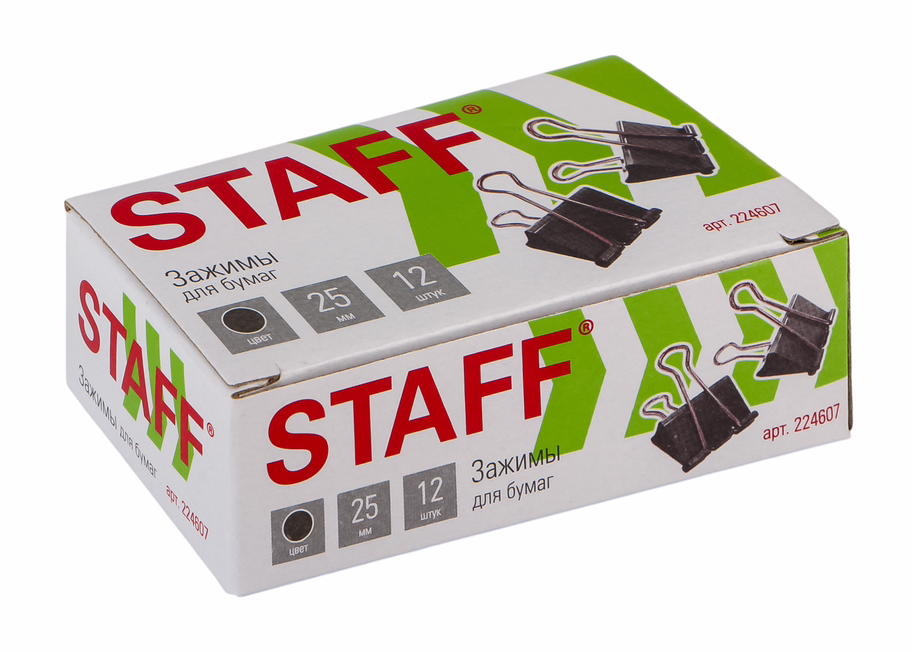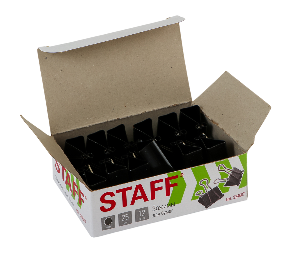 Изготовлены из стали с черным покрытием. Позволяют скреплять до 100 листов. Не деформируют бумагу. Ширина зажима – 25 мм. Поставляются по 12 штук в картонной коробке.
