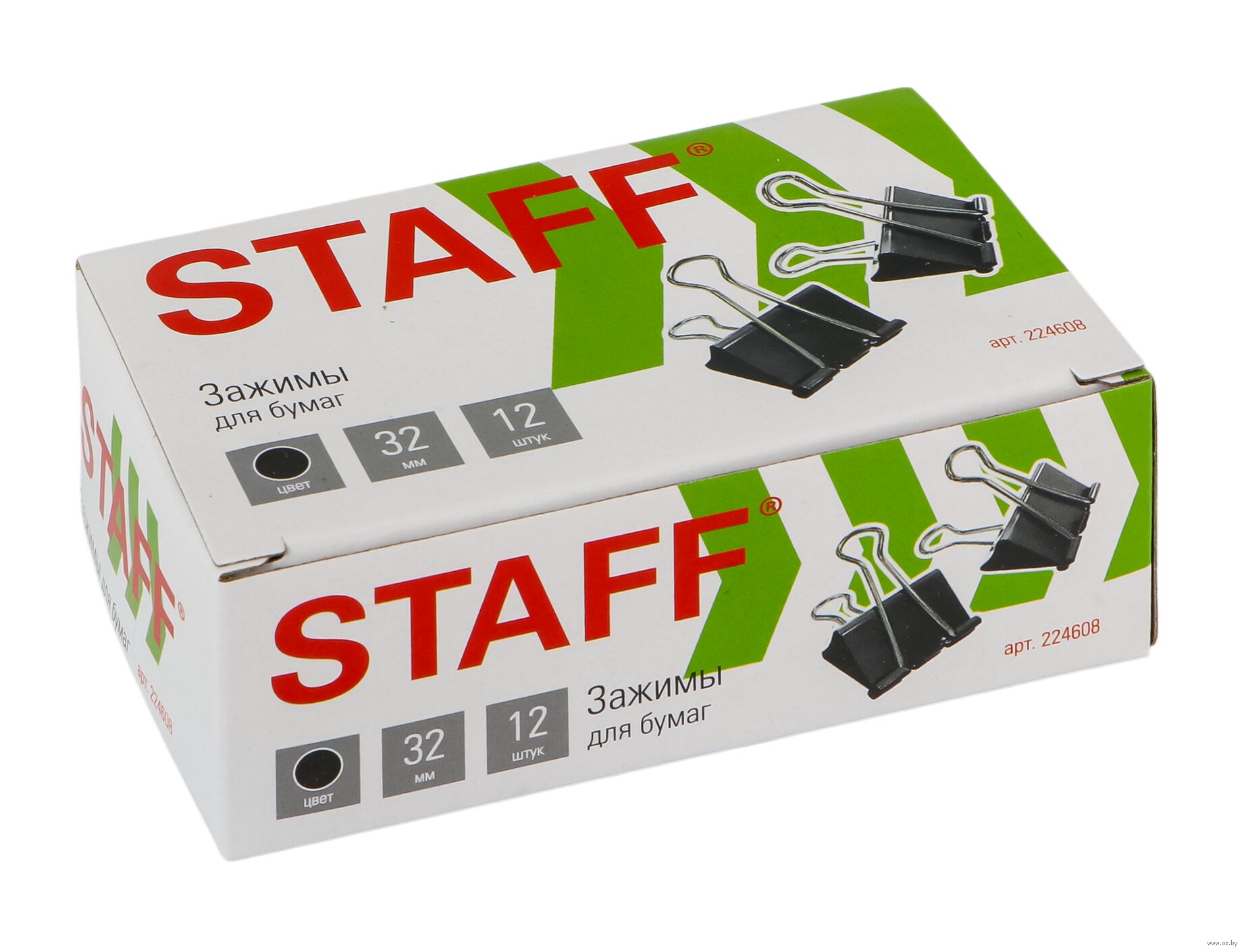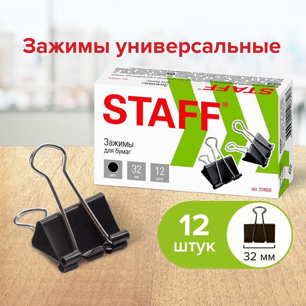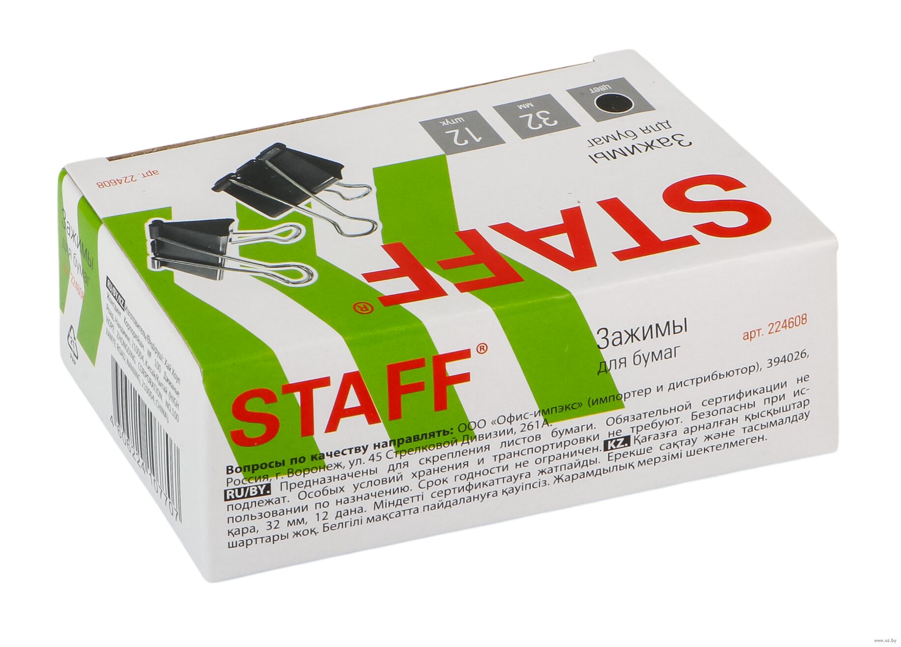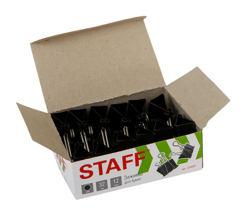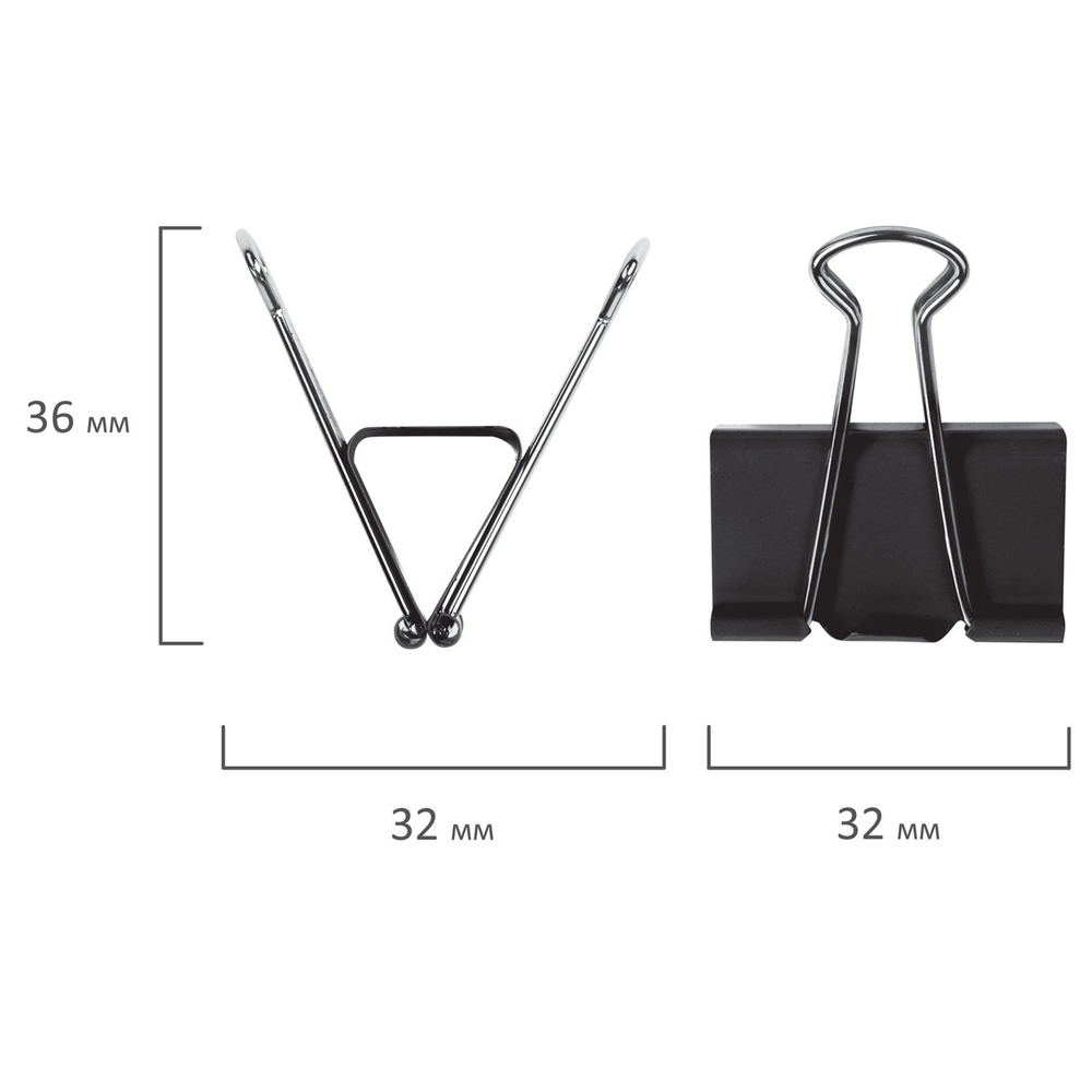 Изготовлены из стали с черным покрытием. Позволяют скреплять до 140 листов. Не деформируют бумагу. Ширина зажима – 32 мм. Поставляются по 12 штук в картонной коробке.