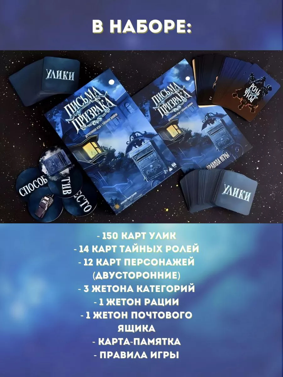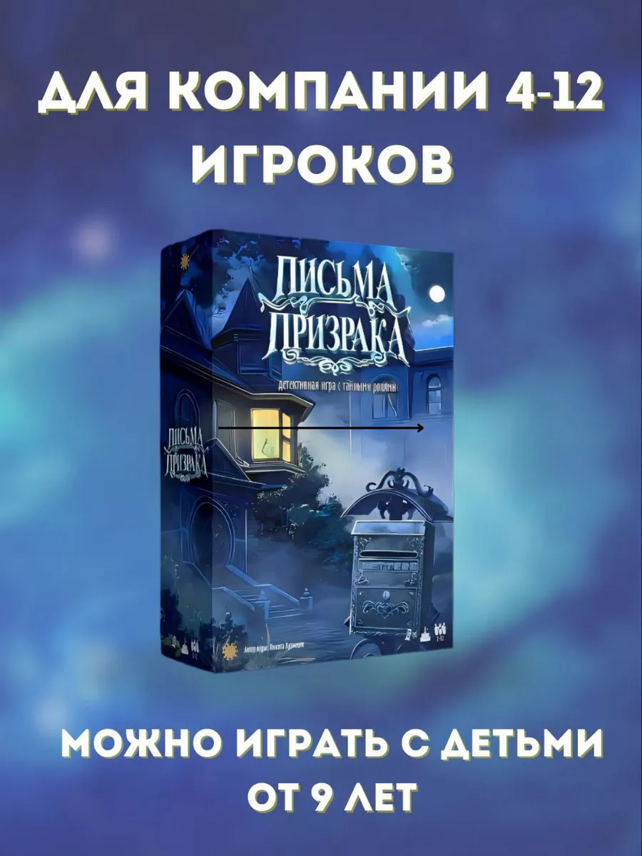 "Письма призрака" – игра с тайными ролями о расследовании преступления. Игроки-детективы из 12 улик (изображений предметов), обнаруженных на месте преступления, вычисляют 3 истинные улики. Детективам помогает игрок-призрак (жертва преступления) с помощью других улик-подсказок, ассоциативно намекая на истинные улики. Среди детективов прячется убийца, который стремится запутать расследование.
