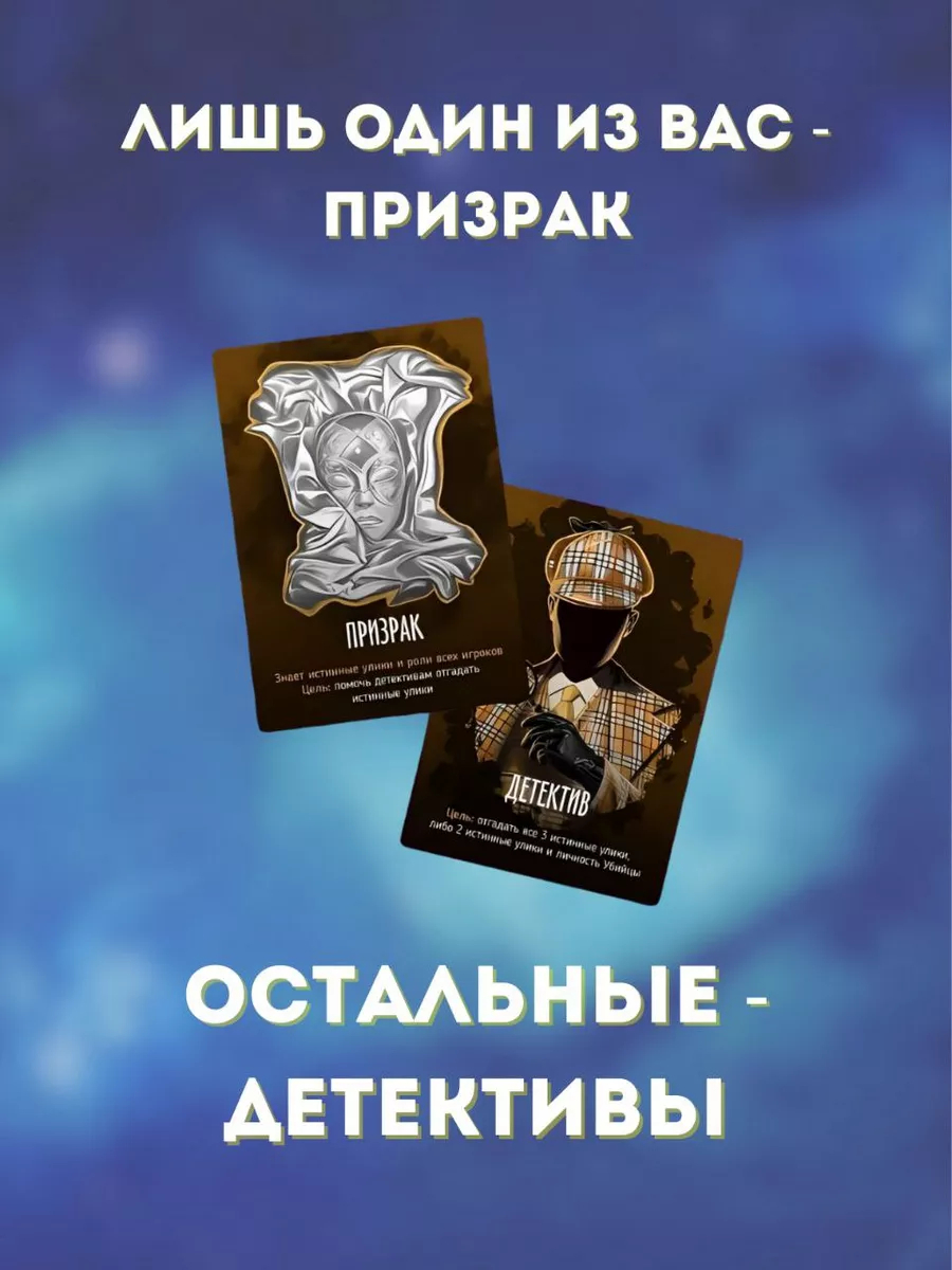 Чем больше игроков, тем больше интересных ролей: сообщники убийцы, свидетель, эксперт, шантажист. В расширенном режиме в игру добавляются карты персонажей с уникальными способностями.