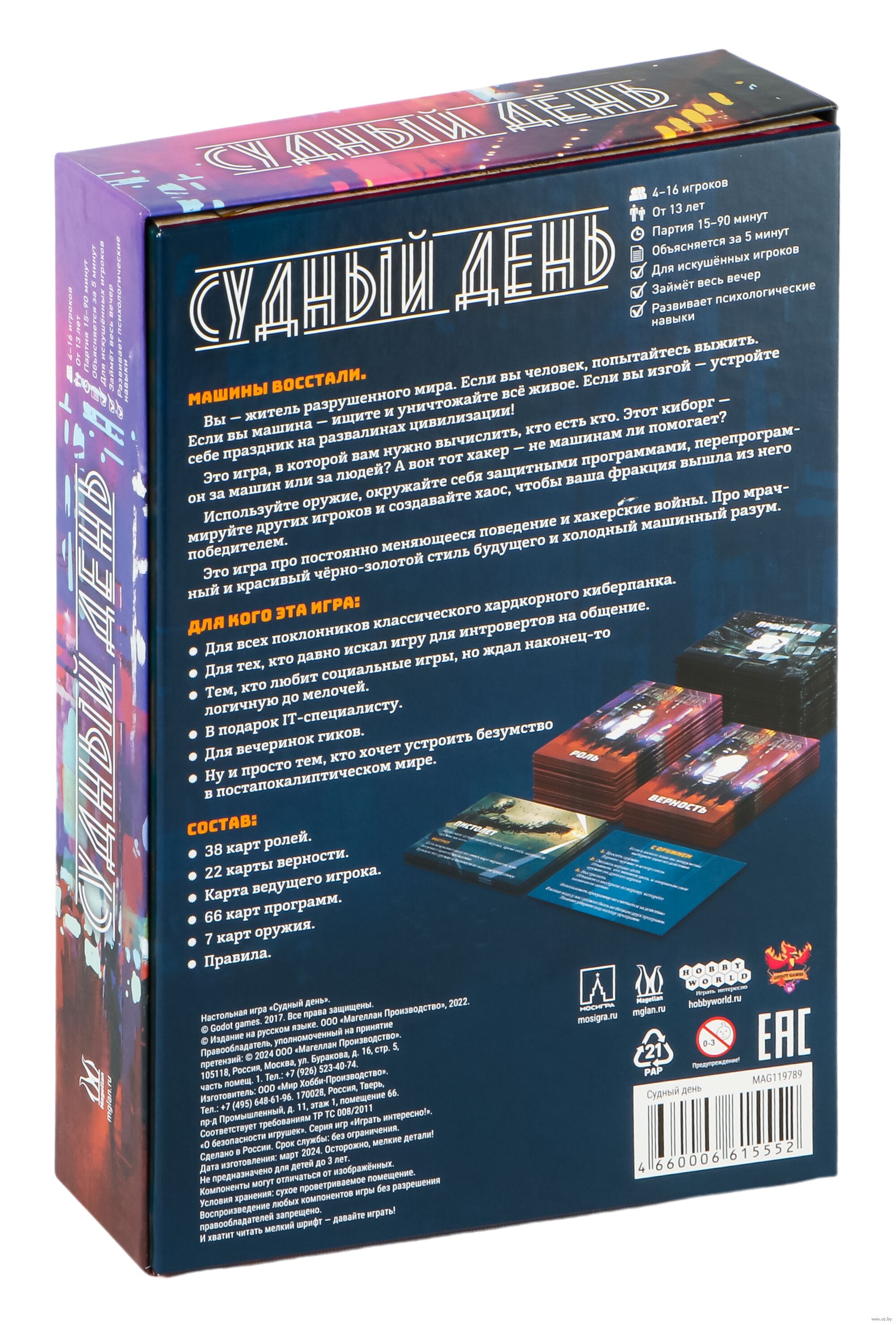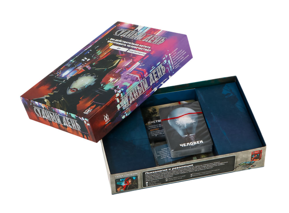 В настольной игре "Судный день" вам достаётся роль выживших людей, машин или изгоев. Люди пытаются выжить, машины уничтожают всё живое, а изгои пытаются обустроиться в новом мире.