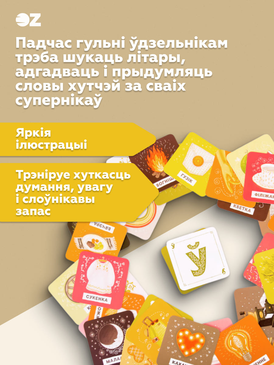 Тры разнастайныя варыянты правілаў робяць гульню цікавай. Вам трэба будзе знаходзіць літары, адгадваць і прыдумляць словы хутчэй вашых супернікаў. Унутры каробкі 100 картак з цудоўнымі малюнкамі і словамі, а таксама слоўнік з перакладам на рускую і ангельскую мовы.