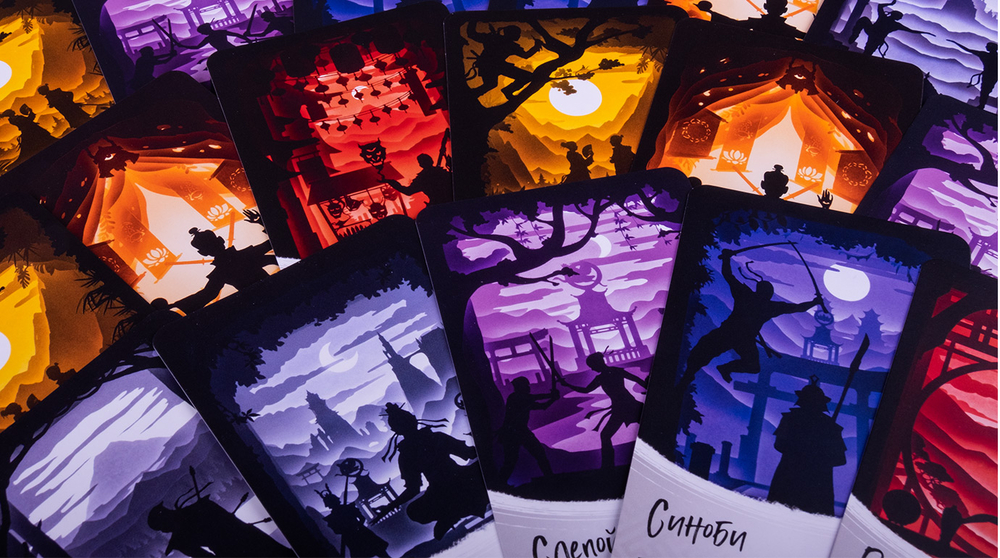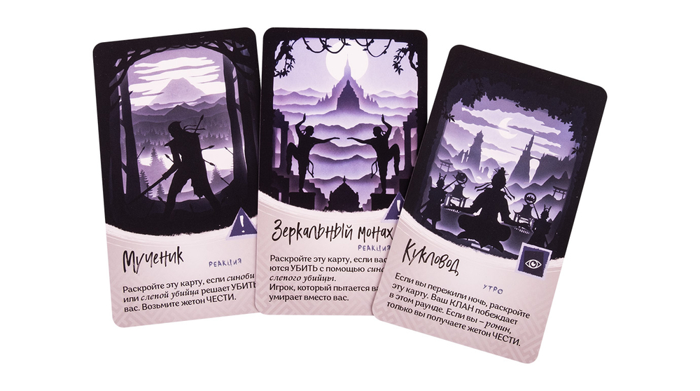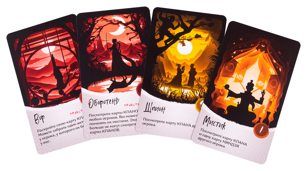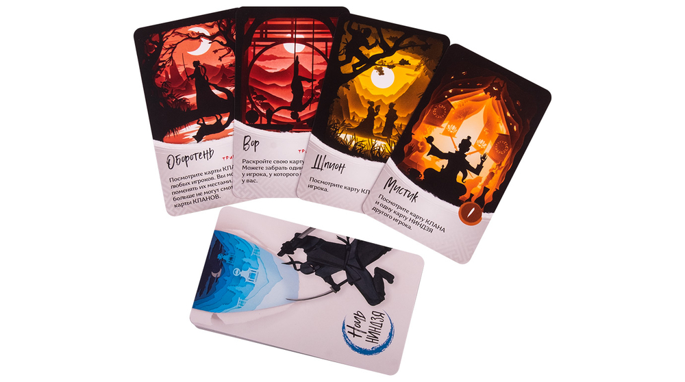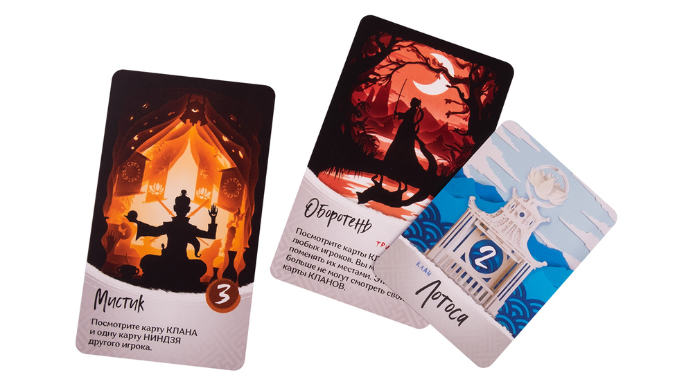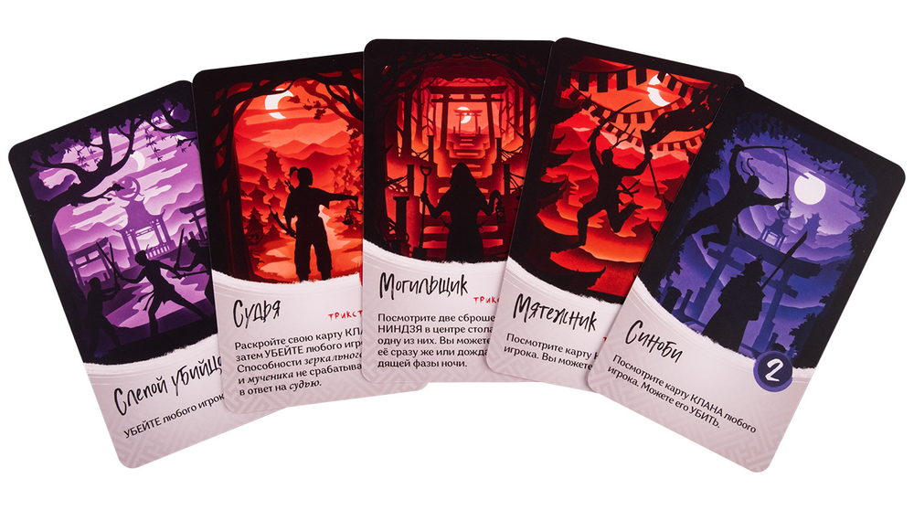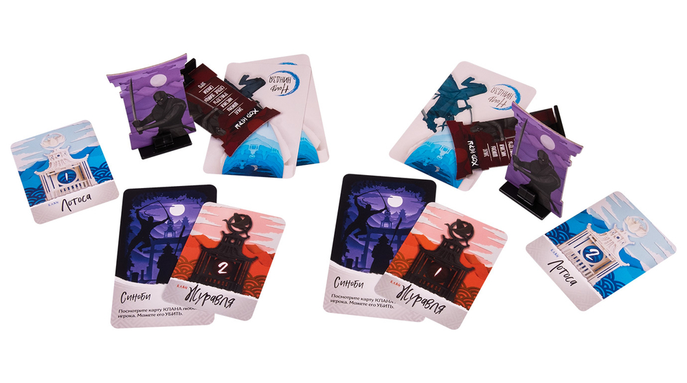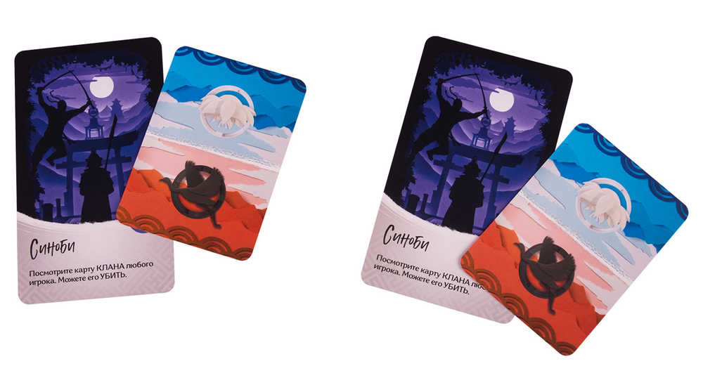 В начале каждого раунда вы получаете карту клана – она покажет, каков ваш ранг в мире ниндзя и на чьей вы стороне. Кроме того, вы получите две карты ниндзя, которые дадут вам возможность вести переговоры, блефовать и устраивать покушения! Шпионы и мистики могут получить немало информации, но не могут убить противника в бою. А вот синоби и слепые убийцы выходят на тропу войны. А ведь есть ещё трикстеры – ниндзя со своими уникальными способностями, которые могут менять роли, воровать честь и даже убивать своего же убийцу!
