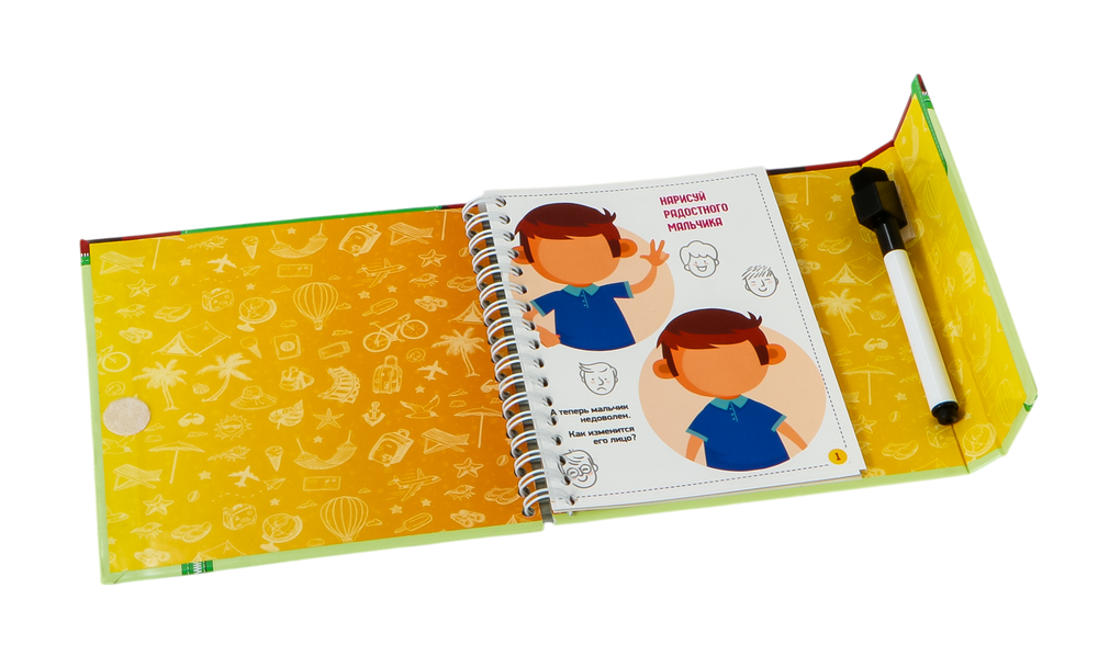 В комплект набора входит книжечка с 20 заданиями, каждое из которых занимает одну страницу, и ответами в конце, а также маркер на водной основе со стирателем, который позволит вам писать и стирать много раз.