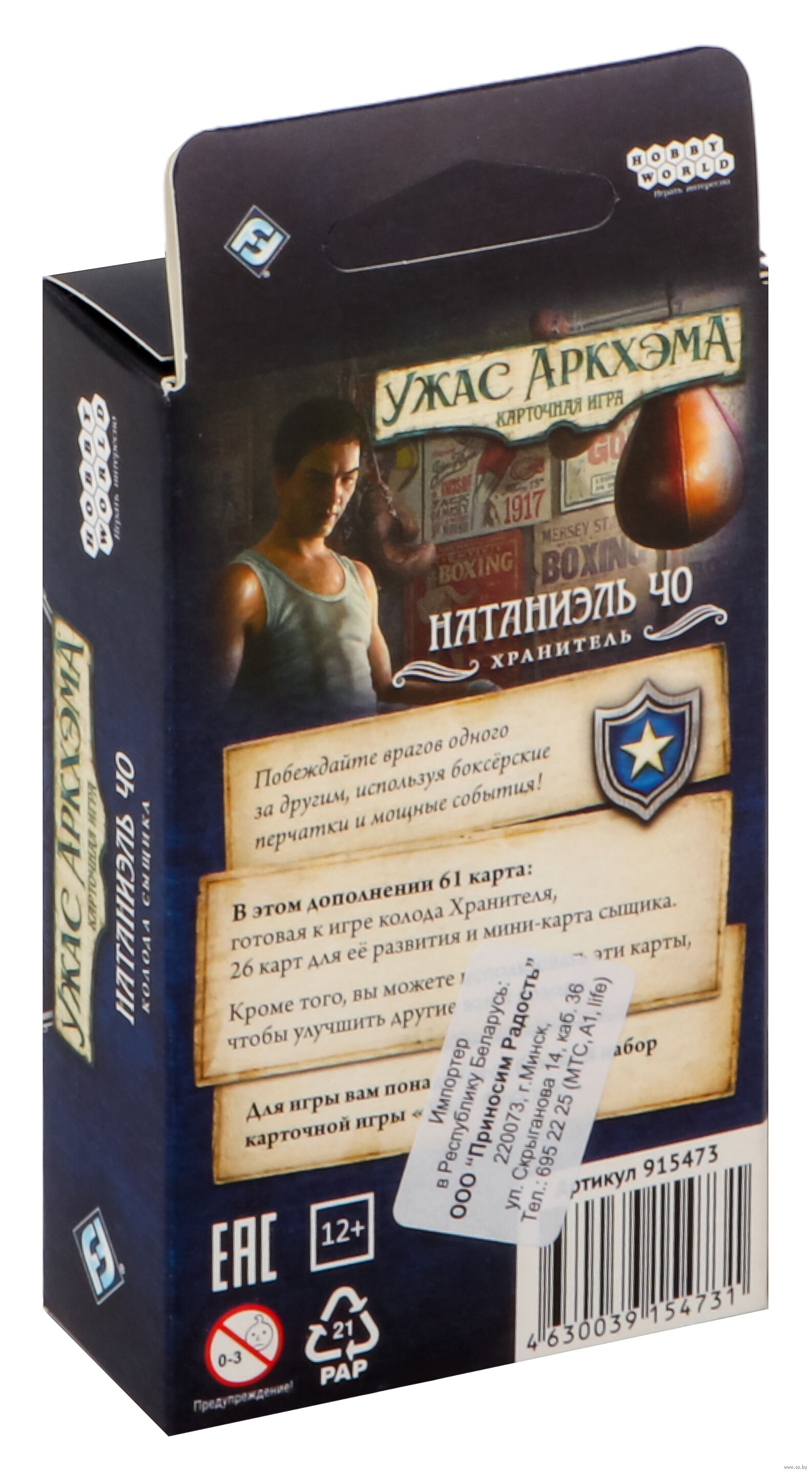 В этом дополнении 61 карта: готовая к игре колода Хранителя, 26 карт для её развития и мини-карта сыщика. Кроме того, внутри вы найдёте советы, как играть этой колодой и развивать её в ходе кампании, и фрагмент истории боксёра Натаниэля Чо.