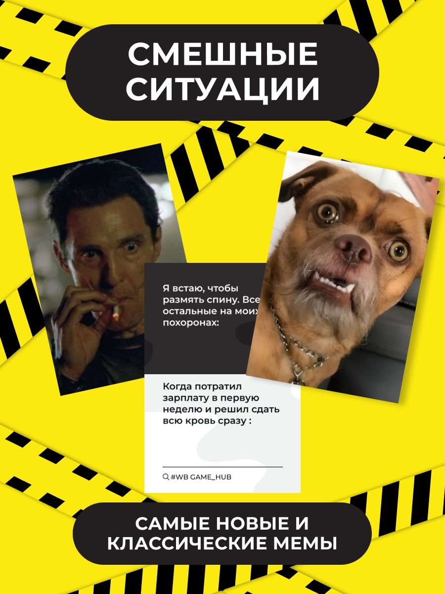 Правила максимально просты – победил тот, кто смешнее! Соревнуйтесь с друзьями,создавая самую смешную комбинацию с максимально веселыми ситуациями и карточкой с мемом!