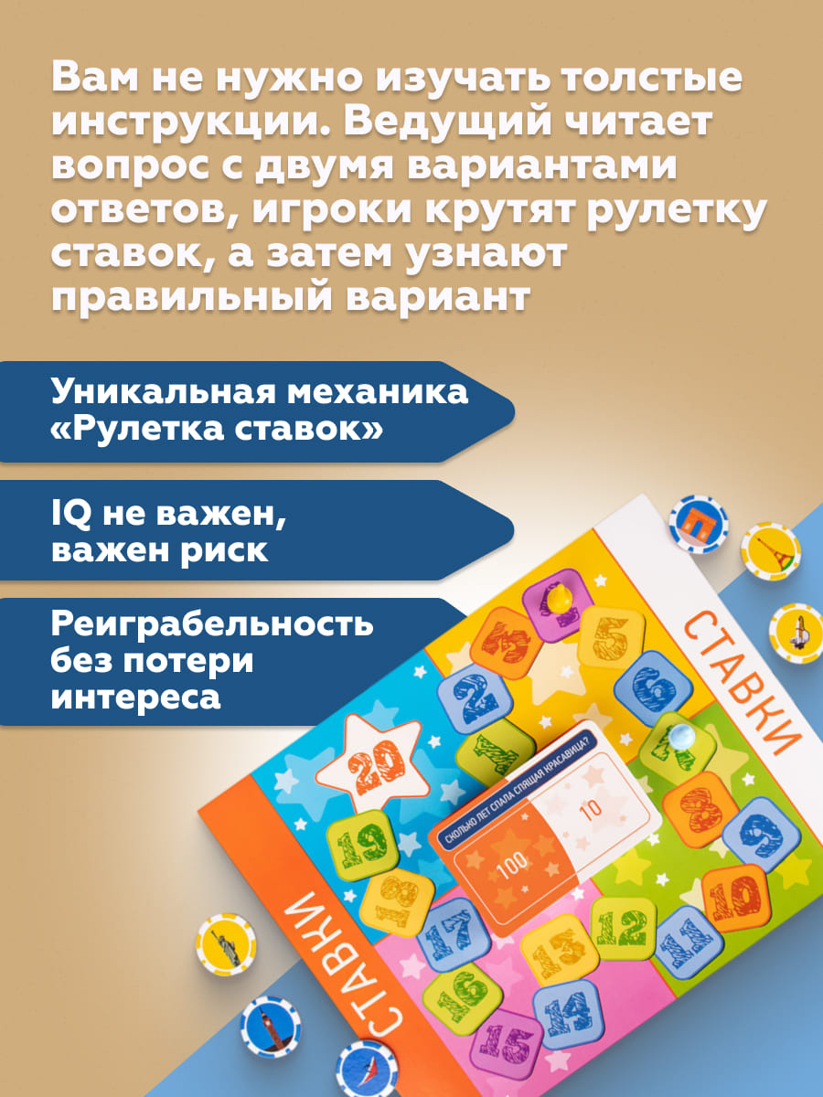 Для победы в игре вам понадобится не столько эрудиция, сколько азарт, сообразительность и интуиция. Игра прекрасно подойдет для веселой вечеринки, встречи друзей или семейного досуга. А возможность ставить ставки сделает игру увлекательной и непредсказуемой.
