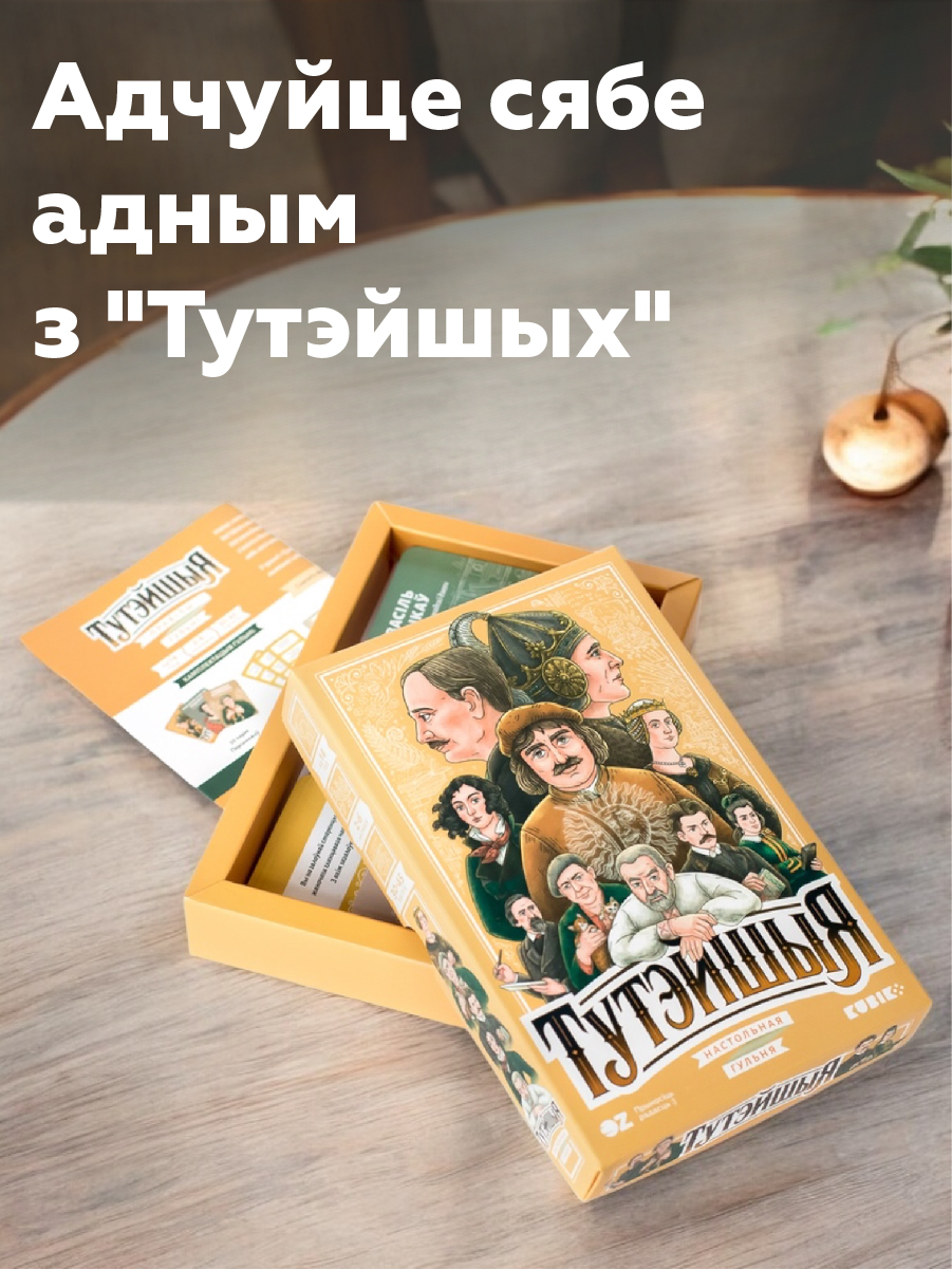 У настольнай гульні "Тутэйшыя" вам давядзецца ў ролі знакамітага беларуса адказваць на каверзныя пытанні і адначасова спрабаваць вылічыць, хто з гульцоў з’яўляецца вашым двайніком. У гульні вы сустрэнеце 50 выбітных беларусаў розных часоў, і зможаце пабыць у ролі кожнага.