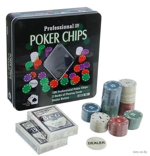 В покерный набор вошли 100 фишек и две колоды карт, выполненных из качественного пластика и покрытых ярким износостойким изображением. Также в комплект входят малый и большой блайнды, фишка дилера – совсем как в настоящем казино!