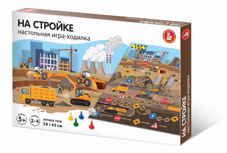 Настольная игра-ходилка "На стройке" – это игра-путешествие по огромной строительной площадке. Специальные знаки указывают на выполнение определенного действия. Возможно, игрокам придется идти назад и обходить опасные участки. Победит тот, кто придет к финишу первым.