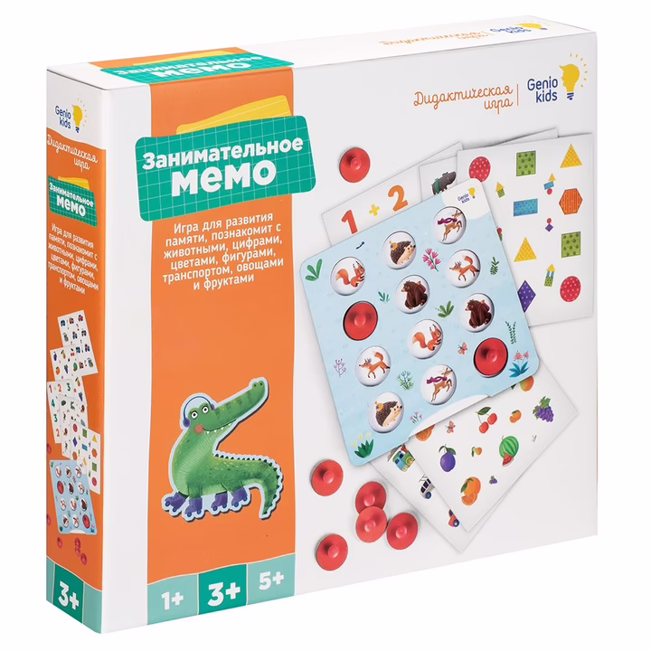 Игра "Занимательное мемо" включает 6 двусторонних карточек, с помощью которых легко познакомить ребенка с цифрами, названиями цветов, овощей и фруктов, названиями животных, геометрических фигур, видами транспорта.